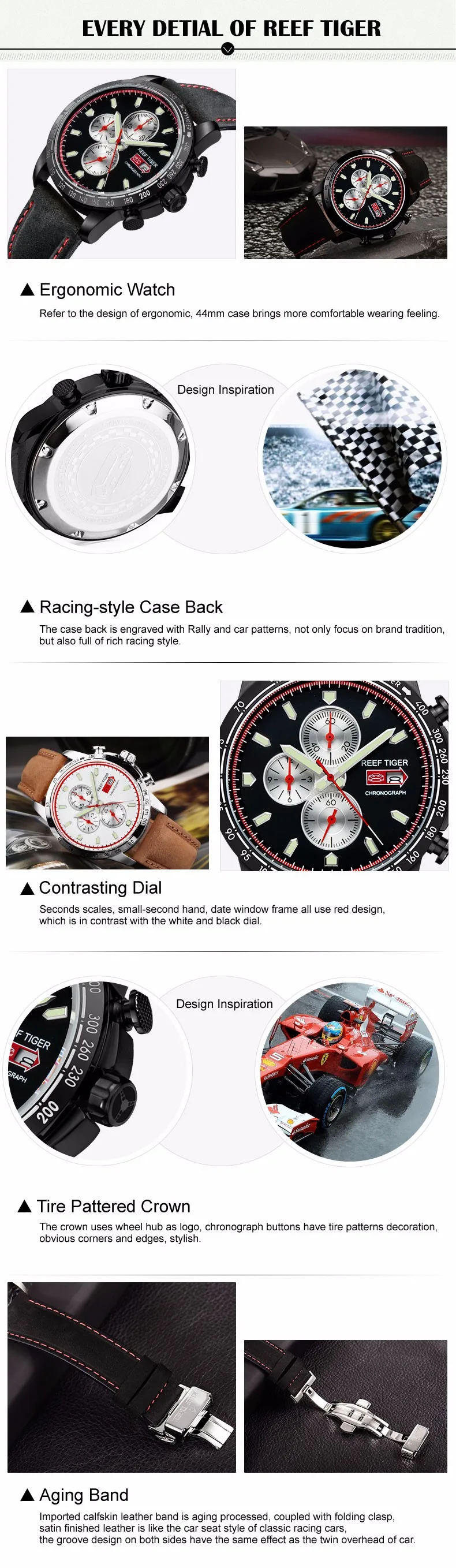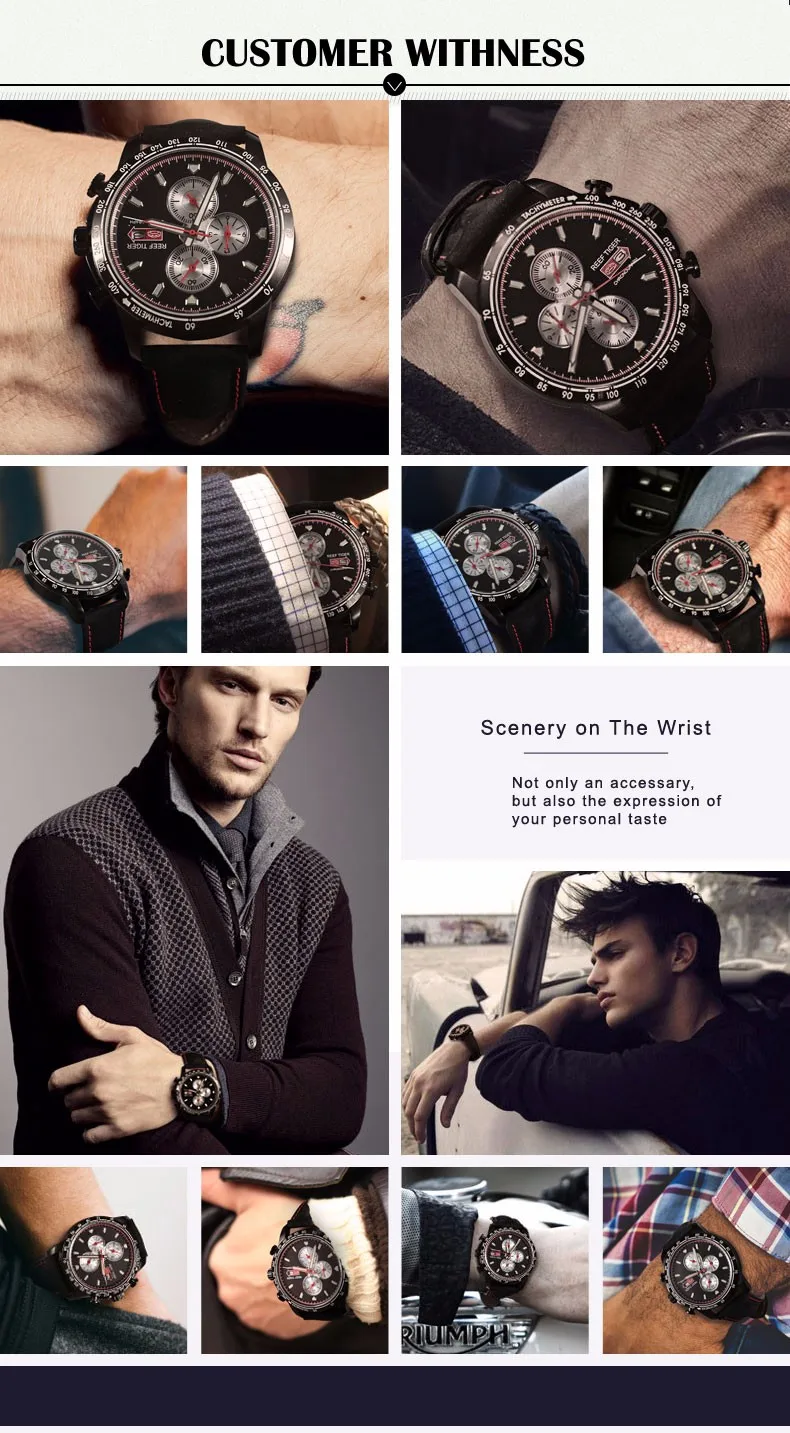 Reef Tiger/RT Sport Watch for Men Chronograph Quartz Watch With And Super Luminous Watch Italian Calfskin Leather Band RGA3029